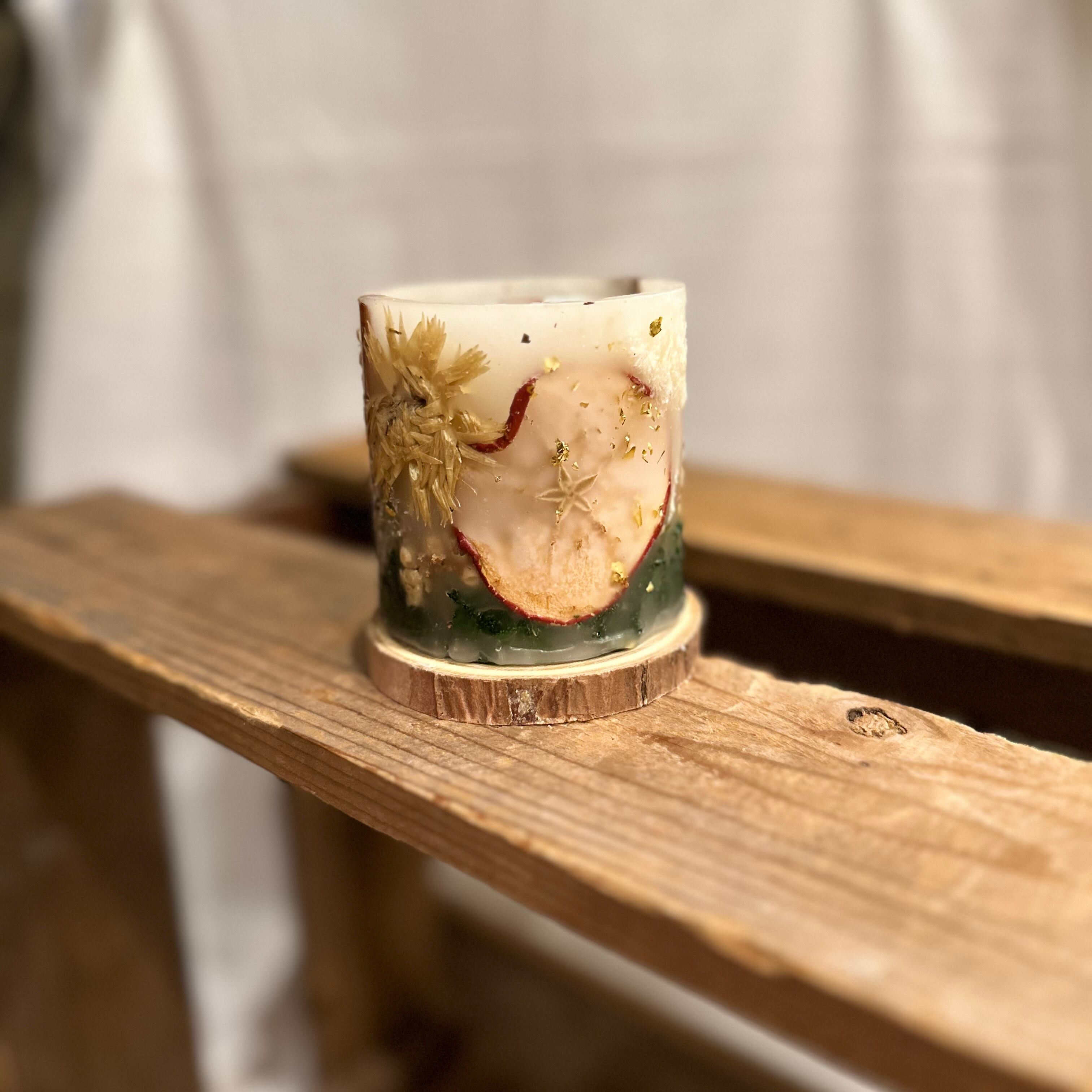 ドライフラワーやドライフルーツでデザインしたbotanical candleです。